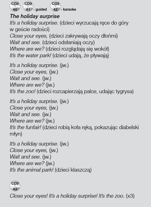 Przyjrzyjcie się obrazkom z podręcznika strona 66. Od 1 do 8 ponumerowano różne miejskie atrakcje. Nazwijcie je, a odpowiedzi zapiszcie w swoich zeszytach. Następnie wysłuchajcie piosenki "The holiday surprise" lub przeczytajcie jej treść poniżej.