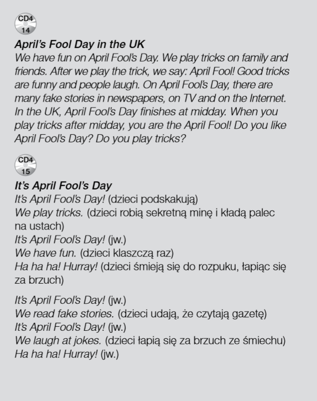 Czas płynie nieubłaganie, it's Easter Time! Przed nami Święta Wielkanocne. Wprowadzamy się dzisiaj w świąteczny nastrój. Świętem poprzedzającym Święta Wielkanocne jest Prima Aprillis, czyli April Fool's Day. Spójrzcie w swoich podręcznikach na stronie 79, znajduje się tekst związany z obchodami Prima Aprillis w Wielkiej Brytanii.