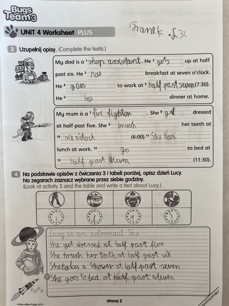 Prace Franka L. Przywiązujcie większą uwagę do poprawnej pisowni wyrazów. Przypominamy jeszcze raz godzina 16 to four o'clock, 18 six o'clock. Zgodnie z godzinami na tarczy zegara.